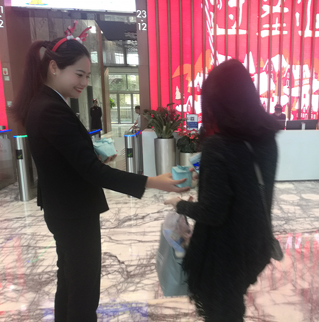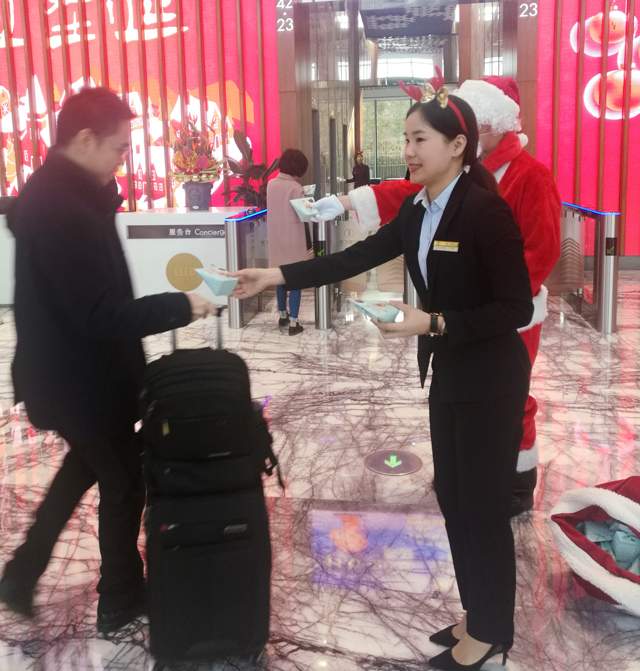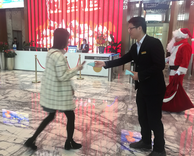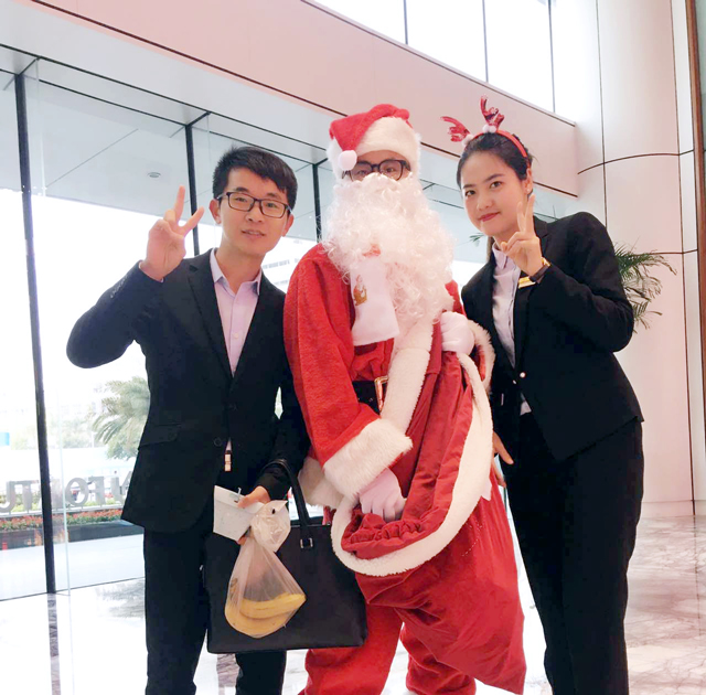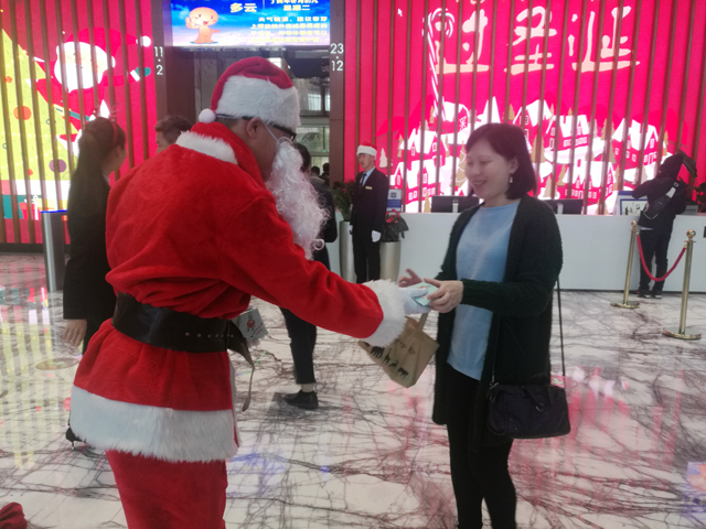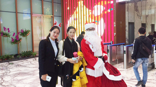 ? ? ? ? 為了感謝大廈租戶對財富中心物業(yè)服務(wù)中心工作的大力支持,讓租戶們度過一個快樂、美好的節(jié)日,2017年12月25日上午,財富中心物業(yè)服務(wù)中心的工作人員化身圣誕老人,穿著大紅袍,戴著圣誕帽,貼著白胡子,扛著裝滿圣誕禮物的紅布袋,一大早就來到西大堂等待著前來上班的租戶們,準(zhǔn)備為大家送去精心準(zhǔn)備的圣誕禮物。