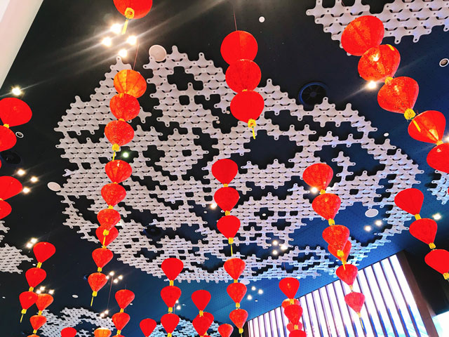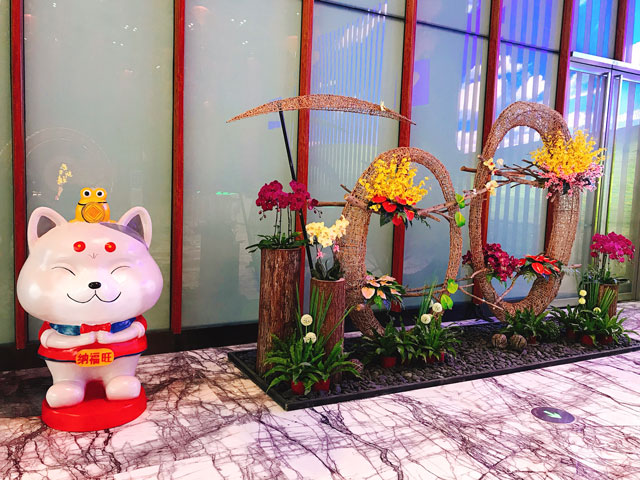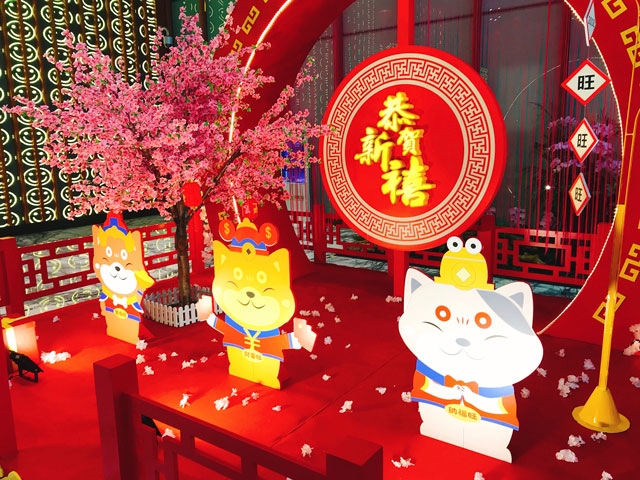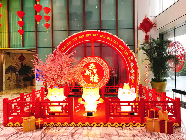 ? ? ???財(cái)富中心整體的春節(jié)裝飾以“中國(guó)紅”為主色調(diào),大堂內(nèi)創(chuàng)新性地加入了傳統(tǒng)的中國(guó)元素,雕刻細(xì)致精美的窗花、顏色鮮艷靚麗的中國(guó)結(jié)、喜慶的紅燈籠,傳統(tǒng)中式設(shè)計(jì)與大廈的現(xiàn)代感完美融合,意境盎然。中國(guó)元素的背景輔以深紅色線簾垂墜,營(yíng)造了傳統(tǒng)中國(guó)的節(jié)日韻味,傳統(tǒng)與現(xiàn)代互相輝映。盛開(kāi)的桃花寓意“大展鴻圖、花開(kāi)富貴?!碑?huà)龍點(diǎn)睛的還是這三只穿著新年衣裳可愛(ài)的吉祥物“財(cái)富旺”、“金運(yùn)旺”和“納福旺”來(lái)給大家送祝福,更添新年的吉祥意境。
