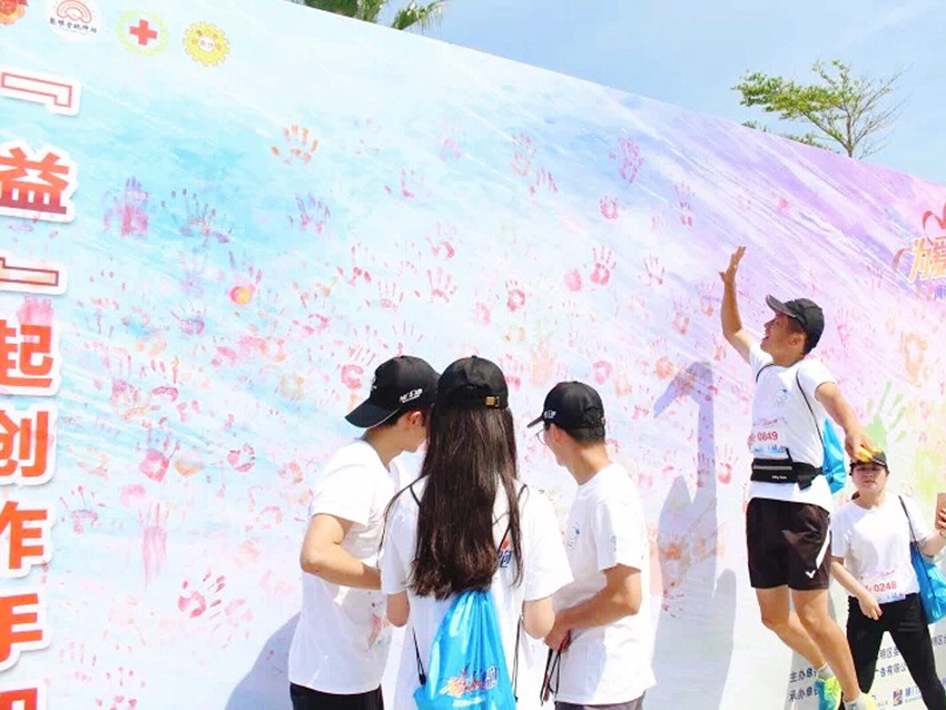 以手為筆,將印有不同顏色的各自掌印,紛紛留在手印墻上,每一個起跳的身影,每一張獨一無二代表著愛心的手印,都被一一定格、記錄,成為賽場上獨一無二斑斕“色彩”。