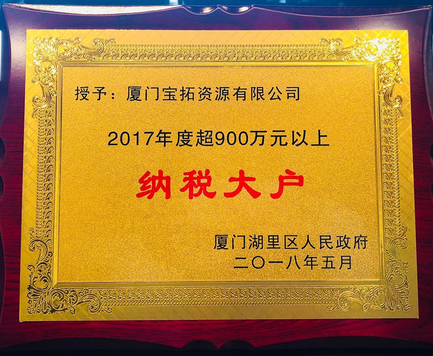 近日,廈門寶拓資源有限公司被廈門市湖里區(qū)政府授予“2017年度超900萬元以上納稅大戶”的榮譽證書。