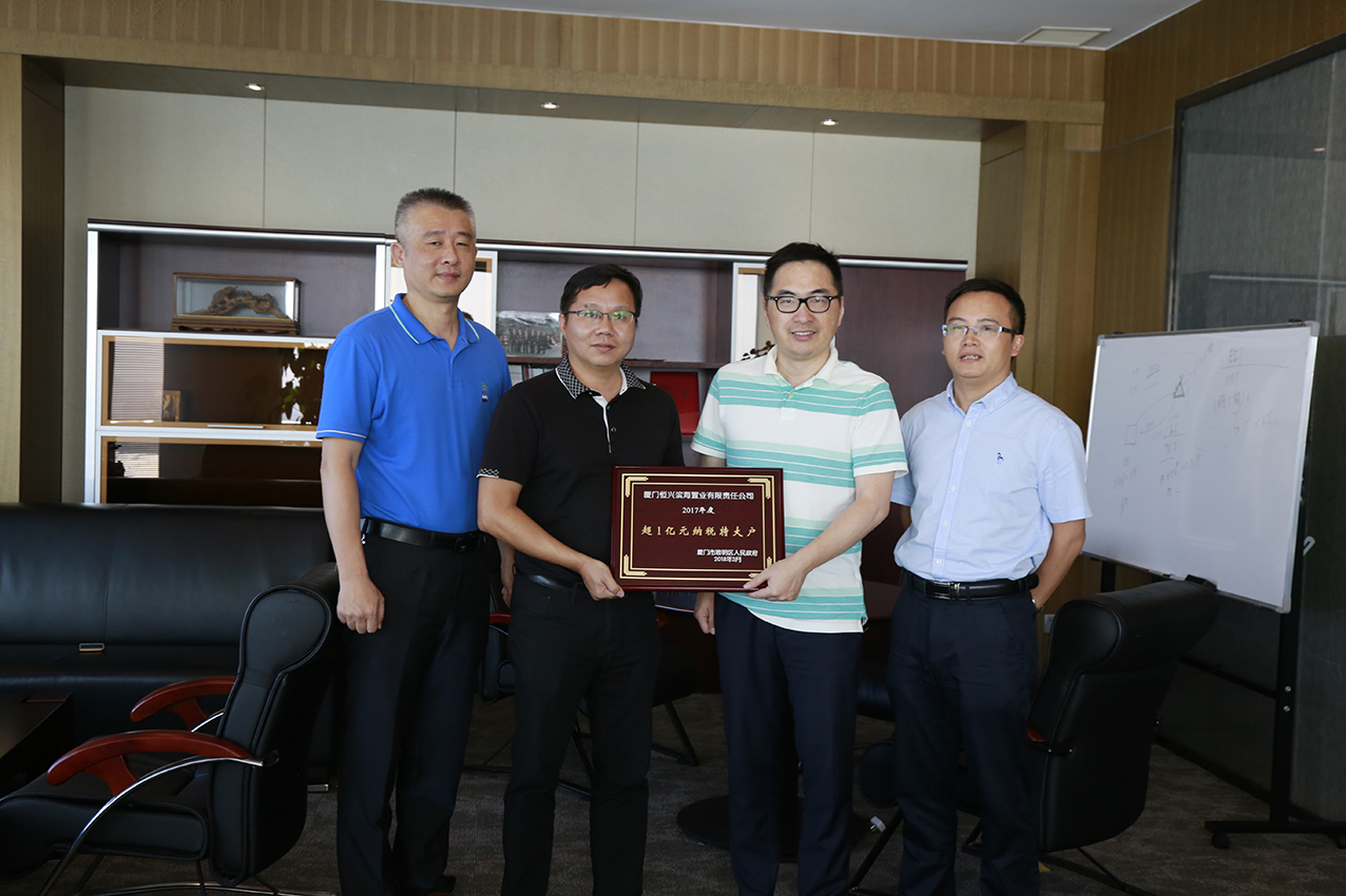 近日,中共思明區(qū)委、思明區(qū)人民政府授予了廈門恒興濱海置業(yè)有限責任公司“2017年度超1億元納稅特大戶”稱號。7月24日,思明區(qū)濱海街道副主任鐘振榮和書記蘇永昌來到財富中心42樓,將納稅大戶牌匾和紅頭文件送到了恒興集團總裁王偉文的手中。