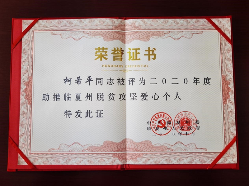 授予柯希平董事長(zhǎng)“助推臨夏州脫貧攻堅(jiān)愛心個(gè)人”