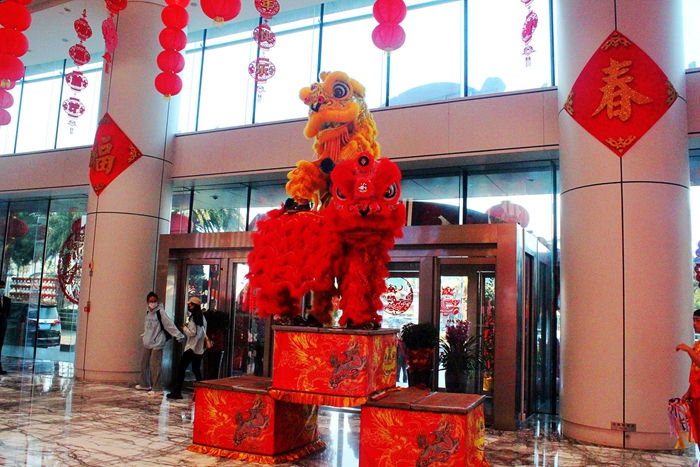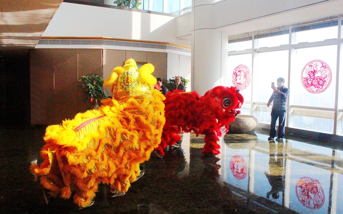 醒獅被認為是象征吉祥如意、求吉納福的吉祥瑞物。鑼鼓喧天中,金獅閃亮登場,精神抖擻地搖擺走來,眼睛一眨一眨,動作既傳神又精神!金獅點睛儀式在財富中心一樓大堂進行,點睛后的金獅猶如被喚醒,時而跳躍,時而登高,時而抖毛……